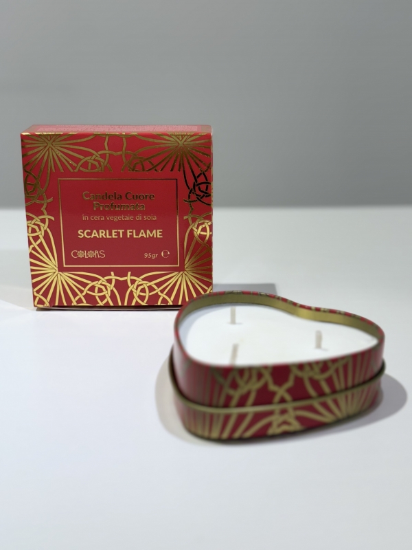 Candela in cera 100% vegetale in contenitore in metallo decorato e coperchio con oli essenziali.