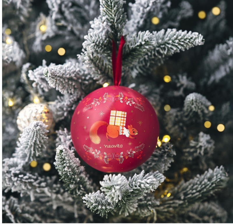 Cofanetto in latta a forma di palla, illustrata in esclusiva per Neavita contiene:8 filtroscrigno di Infuso Mandorle Caramellate.